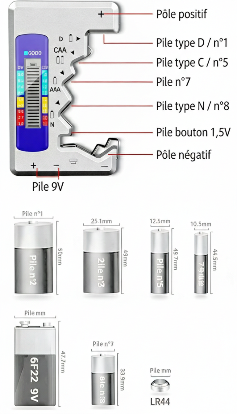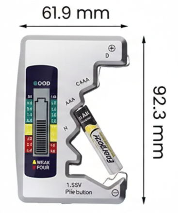 Grâce à son curseur coulissant réglable, cet appareil est compatible avec une large gamme de formats, notamment les piles AA, AAA, C, D, 9V et les piles boutons. L'affichage intégré vous offre une lecture immédiate grâce à un code couleur intuitif : le vert indique une pile en bon état, le jaune une puissance faible et le rouge une pile à remplacer.
