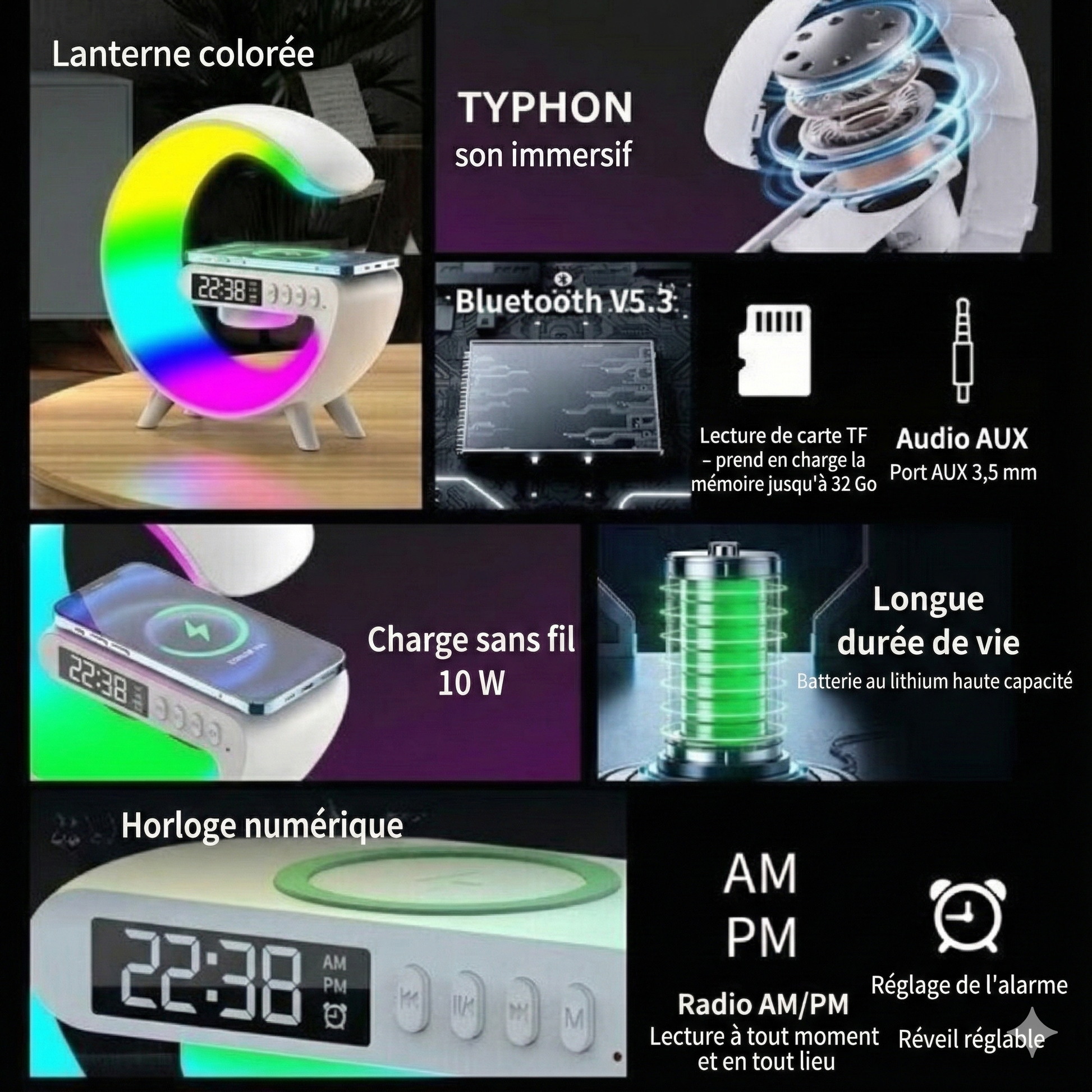 [Nom du produit/système] réagit en temps réel au rythme de la musique et remplit la pièce d'un spectacle lumineux vivant. Chaque chanson est enveloppée d'une lueur chaleureuse et pulsante qui suit chaque battement et chaque mélodie. C'est le son et la lumière en parfaite harmonie.