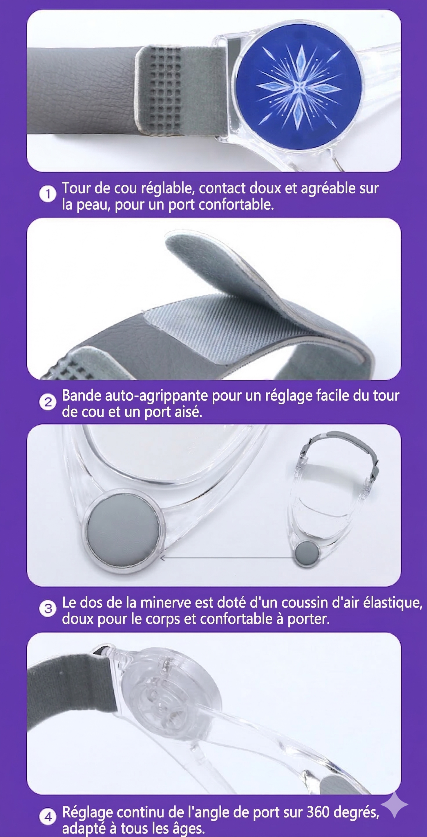 La partie inférieure est fabriquée en silicone souple de haute qualité, offrant un appui à la fois doux et élastique. Ce matériau respectueux de la peau permet une utilisation prolongée sans irritation. Contrairement aux minerves traditionnelles, sa structure légère évite toute sensation d'oppression ou d'encombrement pour une liberté totale.